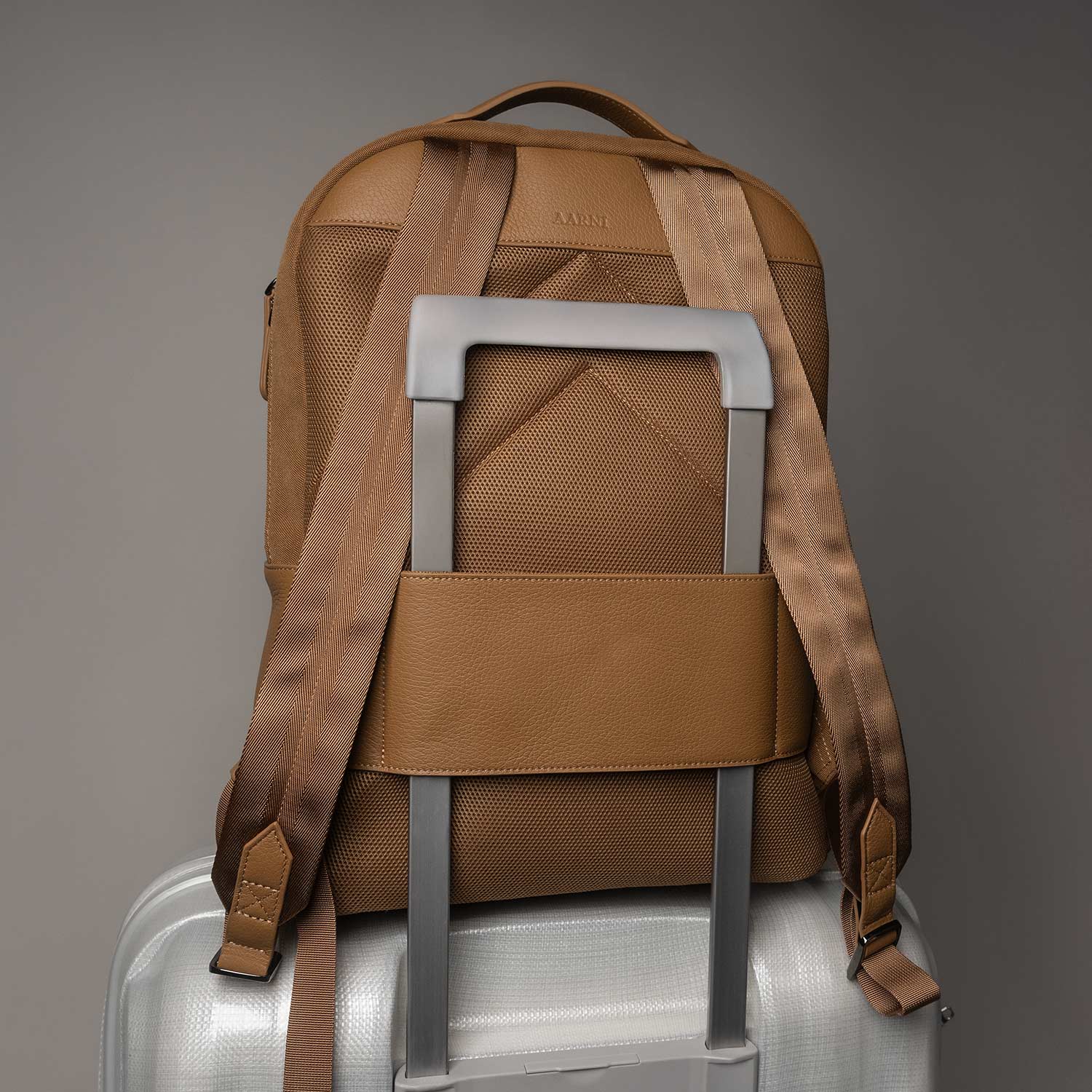 Voit kiinnittää repun matkalaukkuhihnan avulla lentolaukun vetokahvaan, jolloin se kulkee kätevästi mukana lentokentällä.