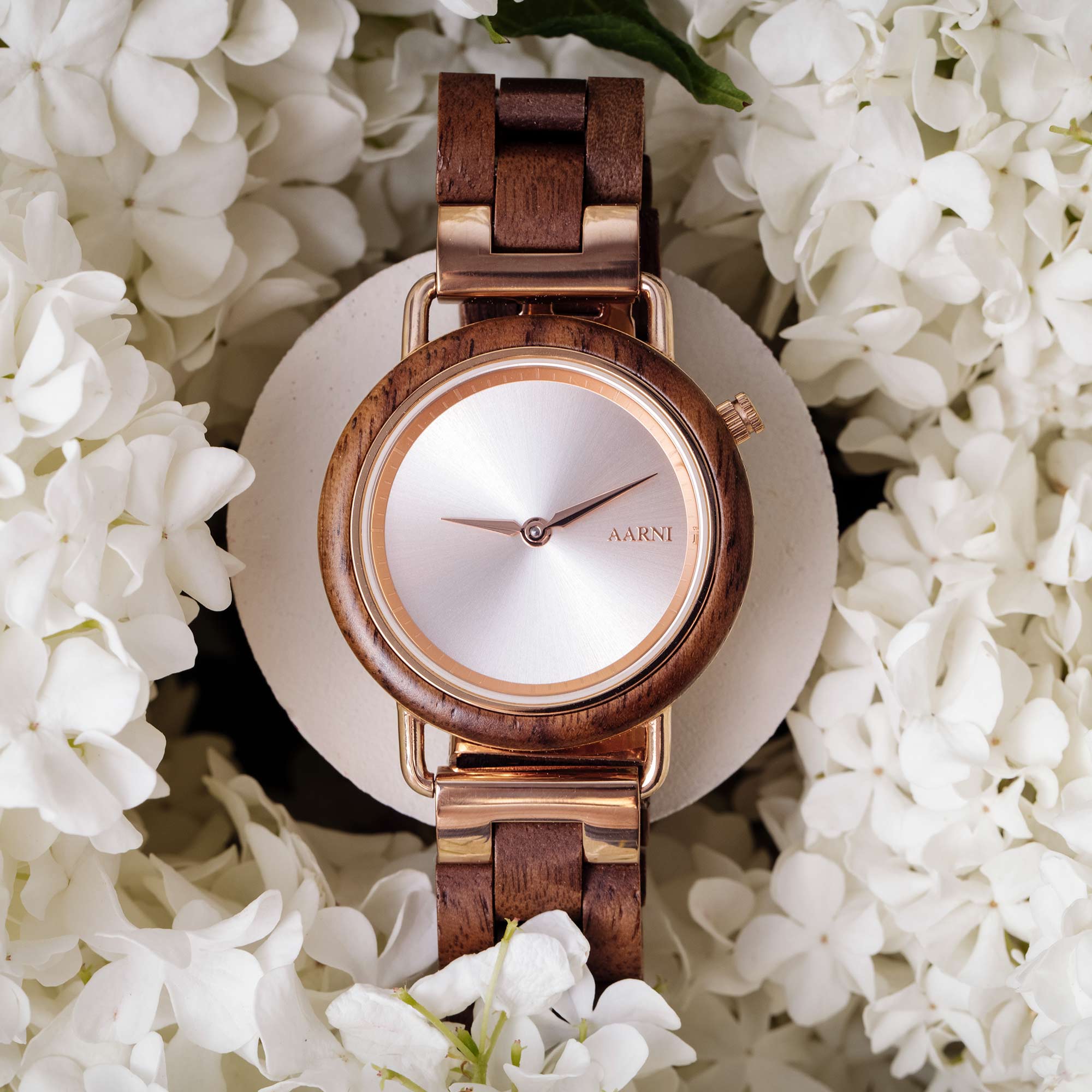 Siro ja säihkyvä. Aarni Saga on upea pähkinäpuinen kello erityisesti naisille. Ruuskultaisten yksityiskohtien myötä tämä kello todella säihkyy ranteessasi.