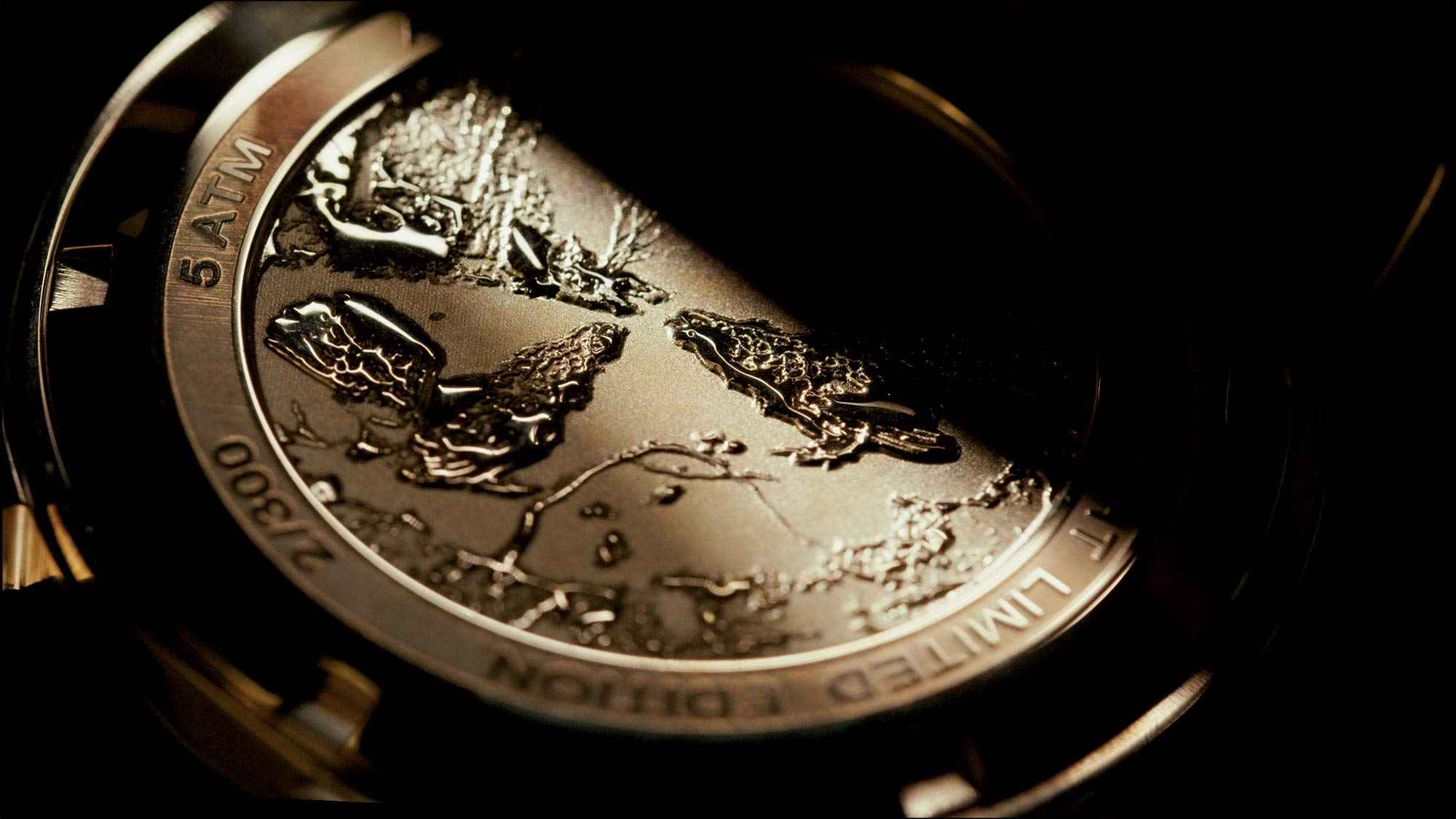 The small capercaillies at the tips of the golden hands move through each other once an hour. The highlights of the artwork can also be found as a three-dimensional engraving on the back of the watch.