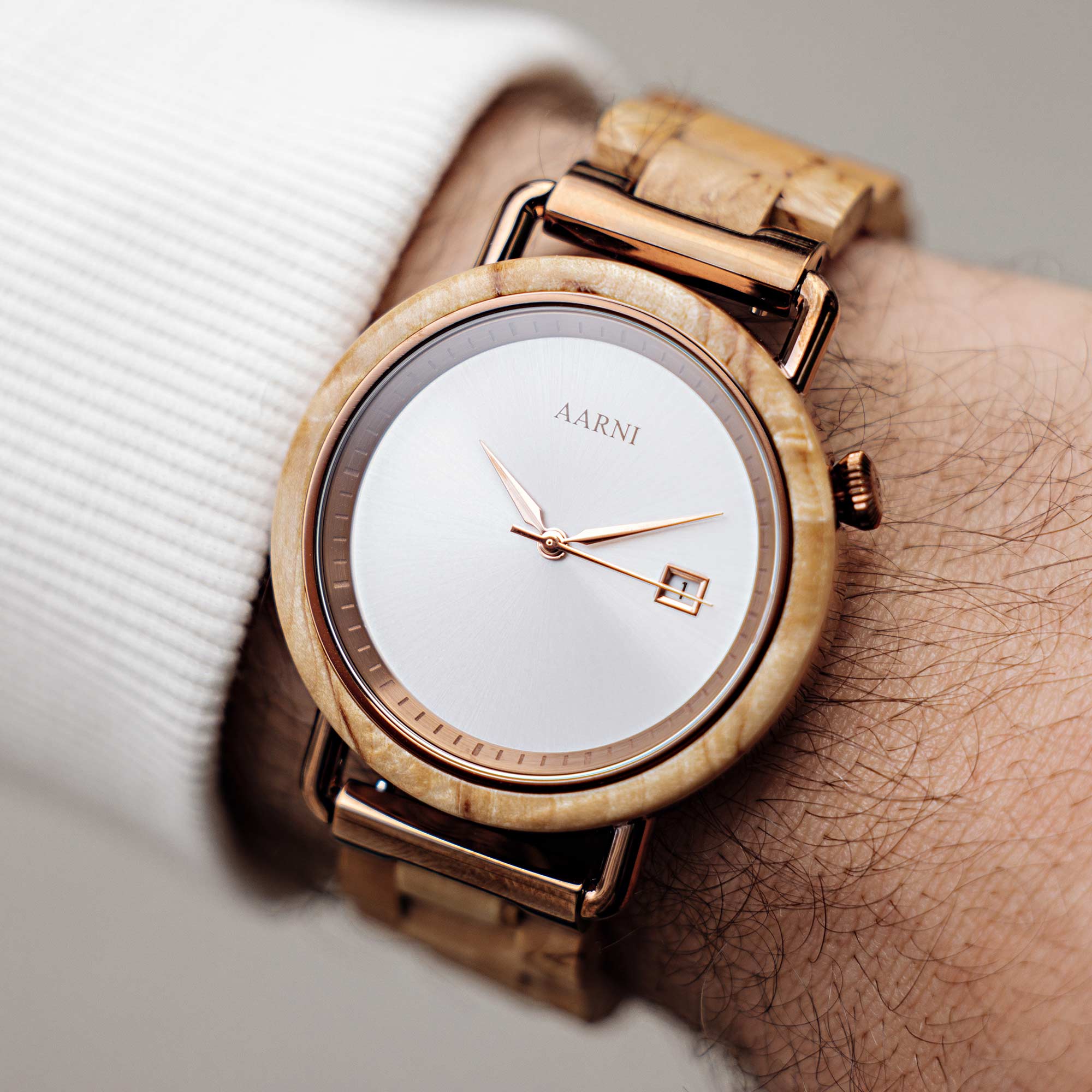 Exceptional Atlas Elegance. Prestigious automatic movement is paired with the marble-like curly birch. Bronze color details and shiny ivory dial capture the eye. The movement can be admired through the sapphire glass.
